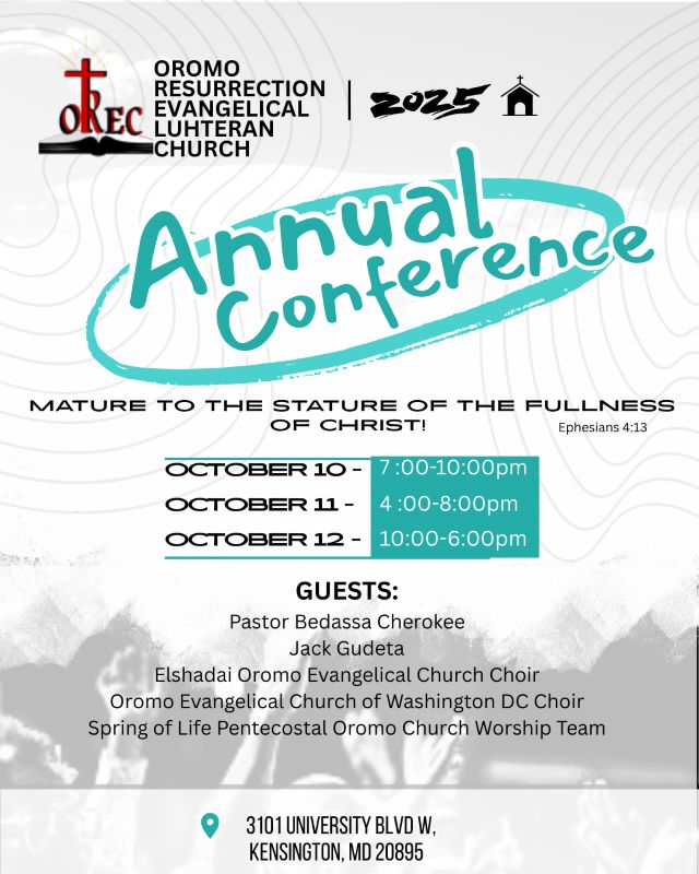 Oromo Resurrection Evangelical Lutheran Church 3101 University Blvd W, Kensington“Mature to the stature of the fullness of Christ!” Ephesians 4:13 Friday October 10: 7pm - 10pm Saturday October 11: 4pm - 8pm Sunday October 12, Morning Service: 10am - …